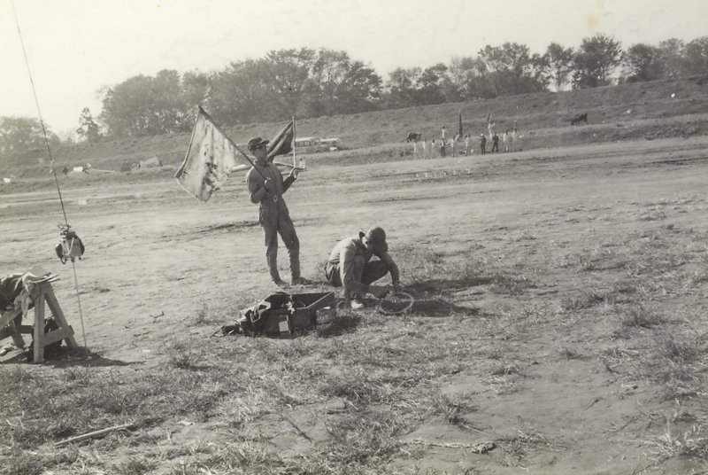 左の写真と同じ時期の合宿風景で、無線機が調子良くない事が多く、旗振りと併用しての連絡。