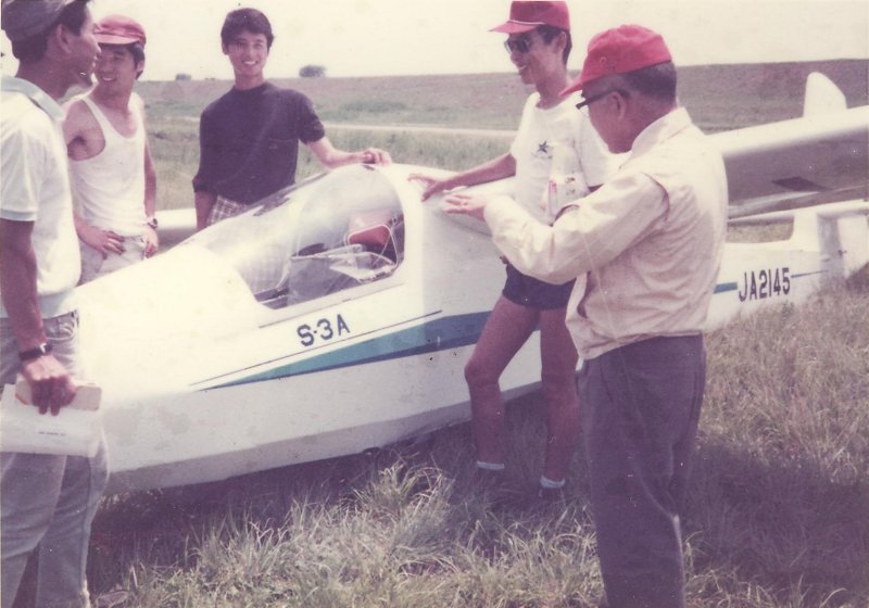 1972年07月 妻沼にて 1972年の7月合宿に、偶然にも新しく製作された太南工業製の国産単座機、相模式S−3の試乗発表会が 妻沼でありました。当校は土手側で合宿を行い、試乗会は川側でした。他に乗れる人がいないため、私がの りました。私にとって初めての単座機でとても感激した事を覚えています。とても素直で易しい機体で、これな ら学生でも乗れるな、などと思い巡らしていました。この時の試乗会総監督は原田教官でした。 因みにこの機体は3機ほど作られましたが、その内の1機が関宿のゴルフ場上空で飛行中に主桁が折れて 墜落しました。慶応の学生だったと思います。主桁が折れた事故は聞いた事が無くびっくりしました。その後、 製作、飛行どちらも中止されました。国産機製造に関しては、それ以後厳しい状況になりました。 左から青山の学生?、藤原君?、大塚君、私、説明者・・(小野) この機体のことはうっすらと聞いたことがあります。日本の航空業界にとってエポックメイキングな機体だった んですね。知りませんでした。座間にあった太南工業には23Cの修理や、TN何とかという単座機の関係で 何度も行きました。それだけにこの機体の失敗はほんとうに残念ですね。(事務局福島) |