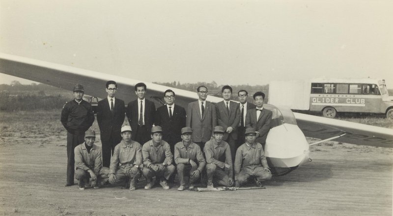 1965年 妻沼にて 私が1年生の時、1965年6月にH23C U型 JA2067が導入されました。 同年11月か12月に、妻沼に様子を見に来た学校関係者(学長含)、都の関係者と共に来られた カメラマンが撮影してくれた集合写真です。東京都から研究機材として購入した為の視察か??? 前列左から1年先輩の吉岡さん、同期の故坂手君、1年先輩の三本さん、私、同期の広川君、同期の佐藤君。 後列左から現照井監督、5番目は多分学長。 後ろには、方向舵にも記載された自作マイクロバス改造トレーラーが写っています。(小野) 航空部にとって貴重な写真ですね。 (事務局福島) |