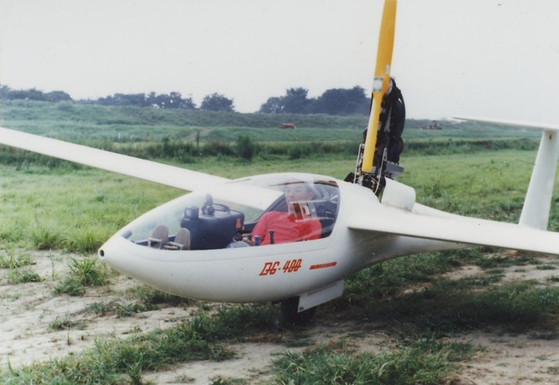 1987年夏合宿、東海大学の合宿と隣り合わせでした。東海大学OBである横井教官の機体DG400が飛来しました。